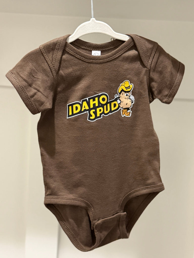 Idaho Candy CompanyDress your little Idahoan in classic Spud style! This cozy brown onesie features our cheerful cowboy “Spud Guy” and bold retro Idaho Spud logo—perfect for tiny fans of the iconic Idaho treat. Soft, comfy, and easy to snap, it’s made for everyday wear, photo ops, and all the adorable moments in between.